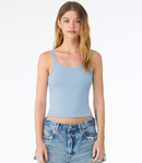 90% airlume combed ringspun cotton/10% polyester. Pre-shrunk.1x1 micro rib.Thick spaghetti straps.Side seams.Cropped length.Tear out label.